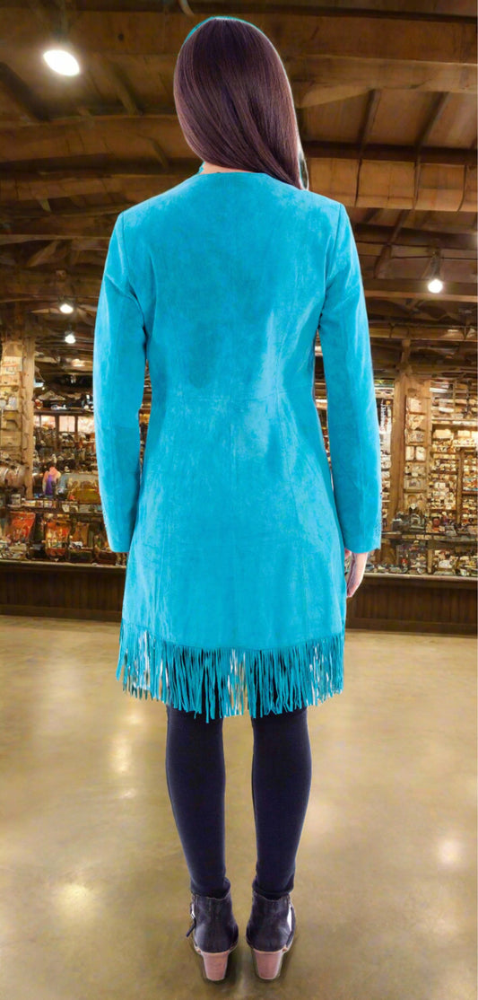 Embroidered Dark Turquoise Suede Coat with Beautiful Fringe by Scully in Size S, M, L, XL, or XXL