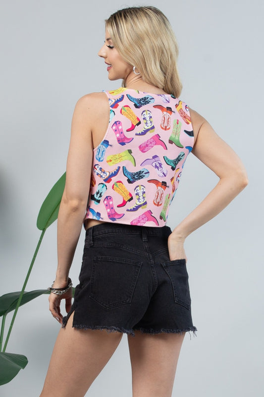 Western Boots Party-Print V Neck Vest Top by Nylon Apparel in Size S, M, L