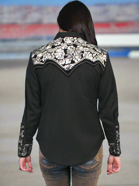 Warrior Blouse in Black with Two Tone Scroll Embroidery by Scully in Size XS, S, M, L, XL, or XXL