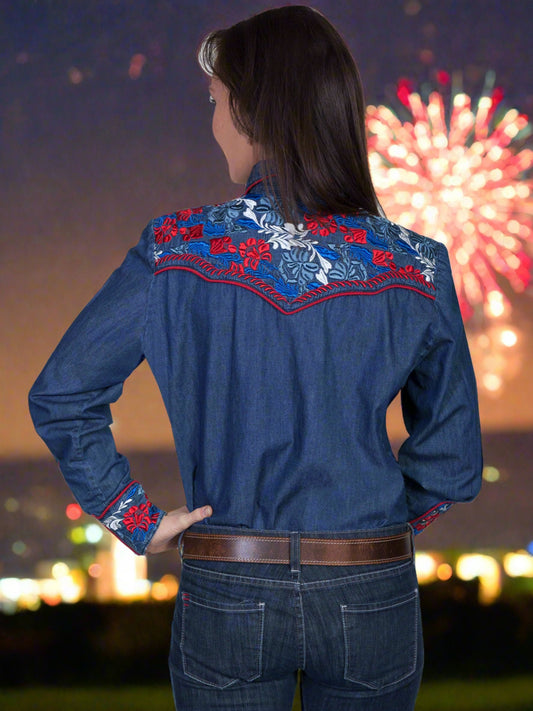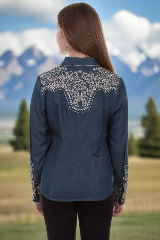 Warrior Blouse in Denim with Two Tone Scroll Embroidery by Scully in Size XS, S, M, L, XL, or XXL