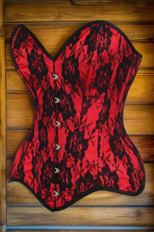 Red Satin with Black Lace Overlay Steel Boned Over Bust Corset